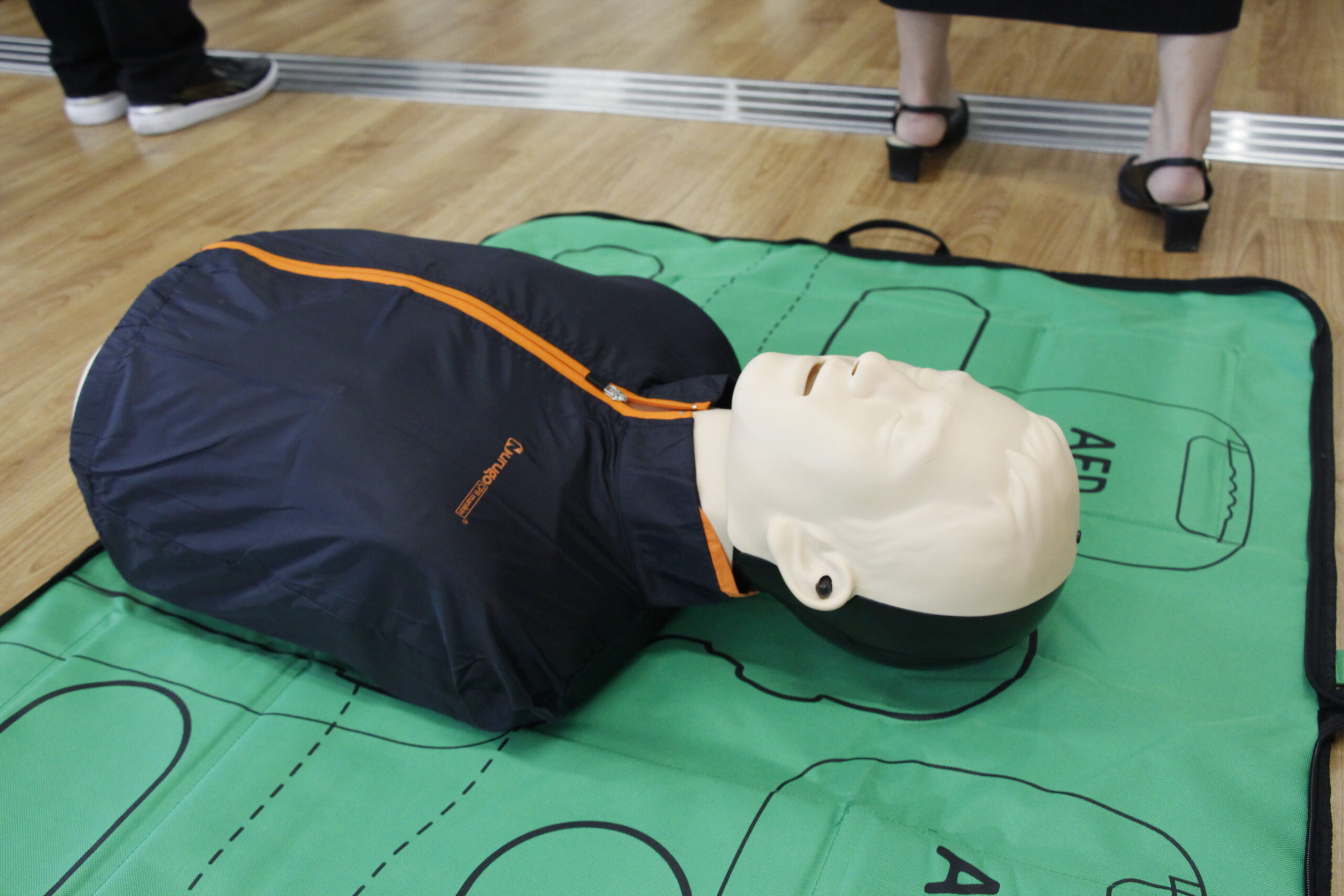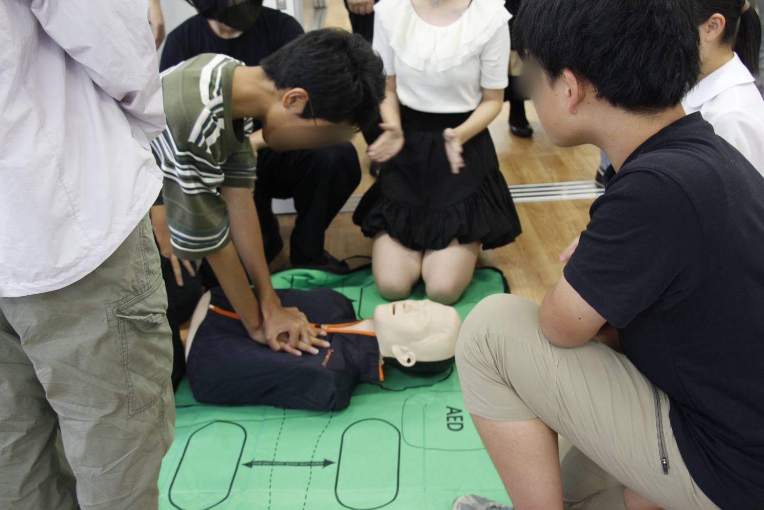 救命座学で学んだ心臓マッサージの仕方とAEDの使い方を実際に人体模型や心臓マッサージ練習用の道具で実践しました。