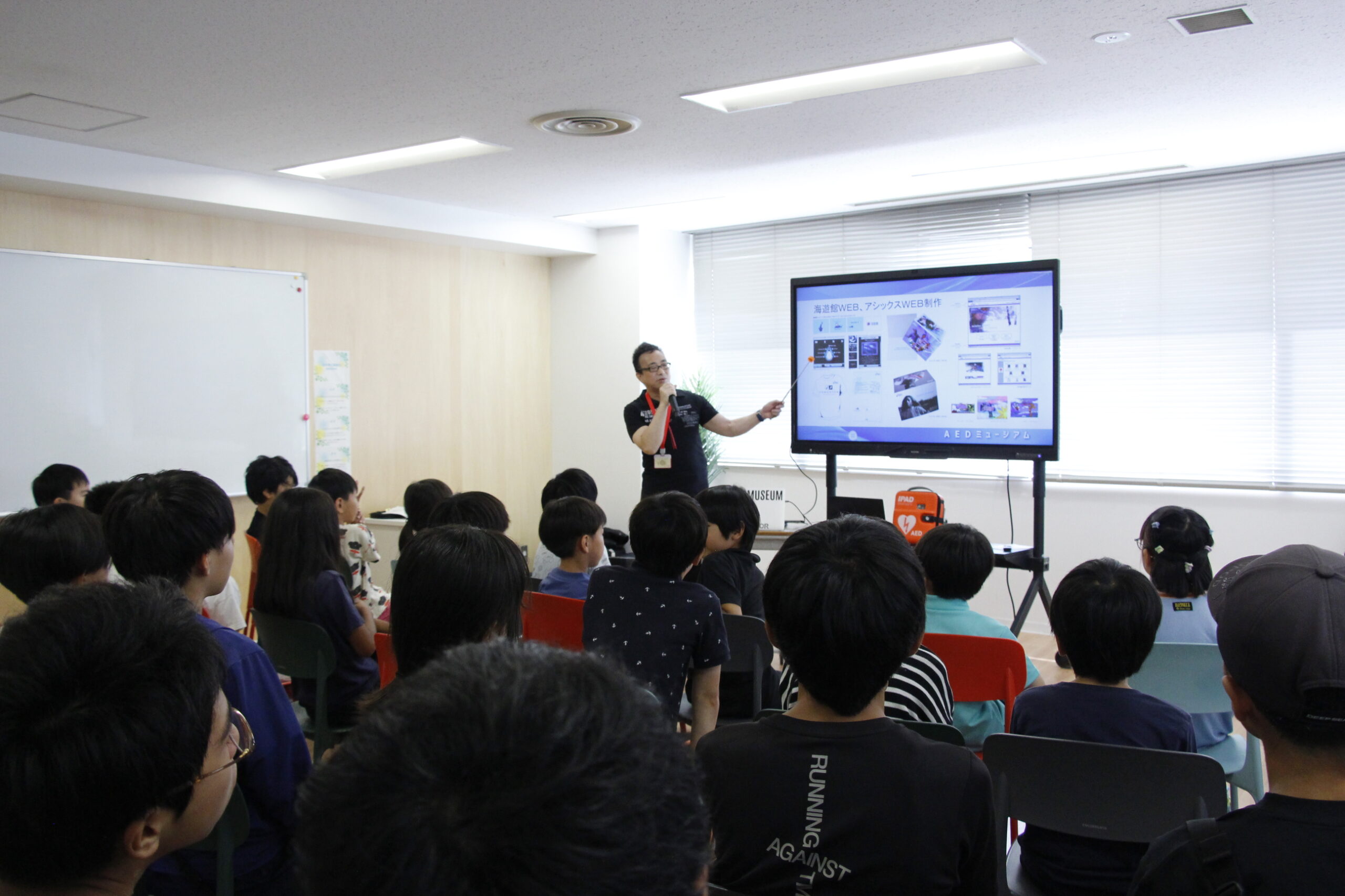 類学舎の先生方がAED講習会を受講した際に「子供たちはAEDについてどれだけ知っているのか?」という疑問から、AEDミュージアム(エム・イー・サイエンス㈱)様や現役消防士の方の協力を経て実施となりました。